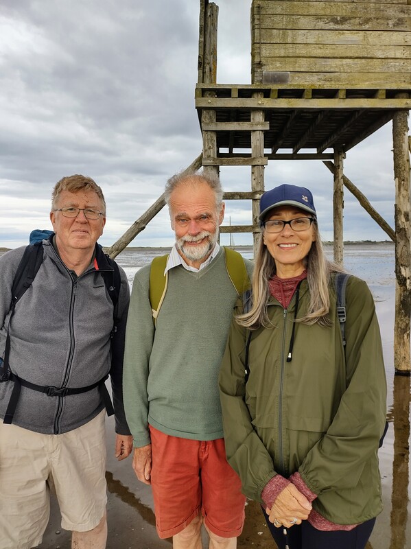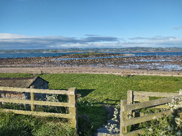 By Monday midday, the tide had receded sufficiently to allow our pilgrim group to cross the causeway in safety to the Holy Island of Lindisfarne and we settled into Marygate House, our base for the week. There was time to unpack and introduce ourselves over a cup of tea before our leader Steve drove us to the mainland so we could walk back to the island across the Pilgrims Way, following the poles across what becomes the seabed when the tide comes back in. Four of us tackled the sands, while one walked along the road causeway. Two chose traditional bare feet, while two used appropriate(?) footwear. Setting off across the sands, we occasionally had to paddle in a few inches of sea water but in patches where mud replaced sand the going was a bit more treacherous. One of us (yes, me) managed to slip over but the only damage was to my dignity and a pair of muddy shorts. We passed a couple or refuges whose ladders looked a bit dodgy but I am sure we could have scaled them if necessary. Barnacle growth on the guide poles indicated how high the sea level would be when the tide came in. As we neared Lindisfarne, the "singing" of seals on a nearby sandbank grew louder, quite an eerie sound. The sands walkers and road walker reached terra firma at about the same. As I also had a car on the island, we didn't have to make Steve walk back again to collect his! Our first day was a great start to the week, with one of the highlights ticked off.